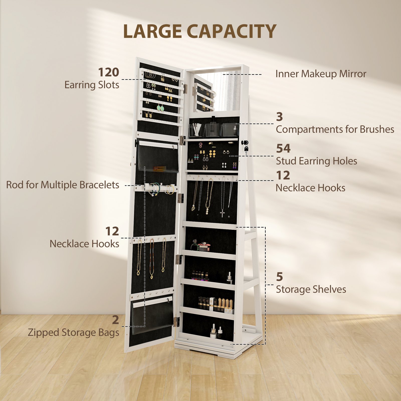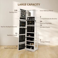 - Inside features multiple earring slots, necklace and bracelet hooks, ring slots and shelves