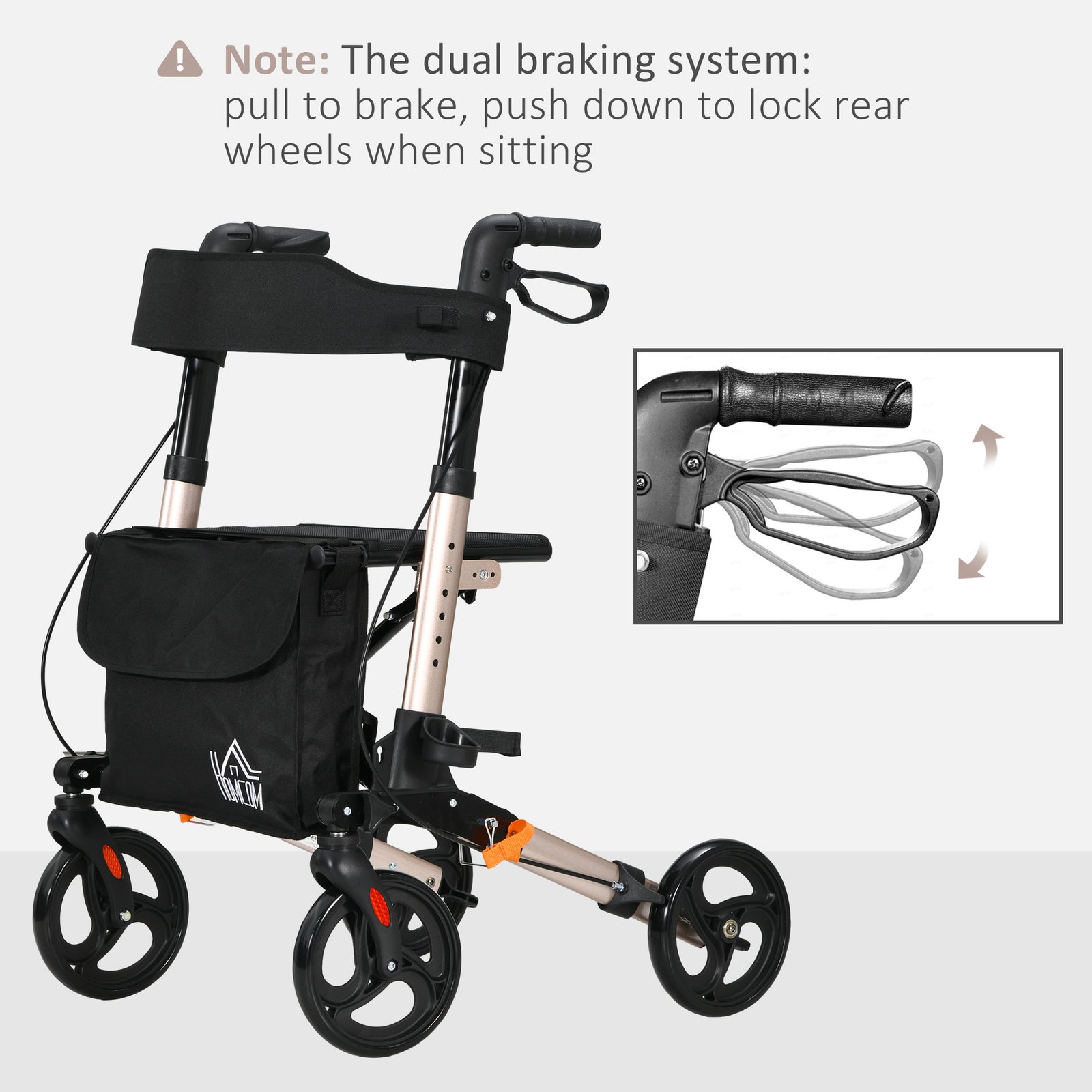 - Note: The dual braking system: pull to brake, push down to lock rear wheels when sitting