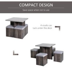 The simple and contemporary 5-piece dining set from HOMCOM is an elegant space-saving dining set ideal for small houses and apartment. The ottoman-style chairs open to reveal convenient storage for magazines and other accessories. Tuck the chairs directly beneath the table of this space-saving dining set to free up floor space when they are not in the use. Wood grain design is stylish and complements to any dining dcor.