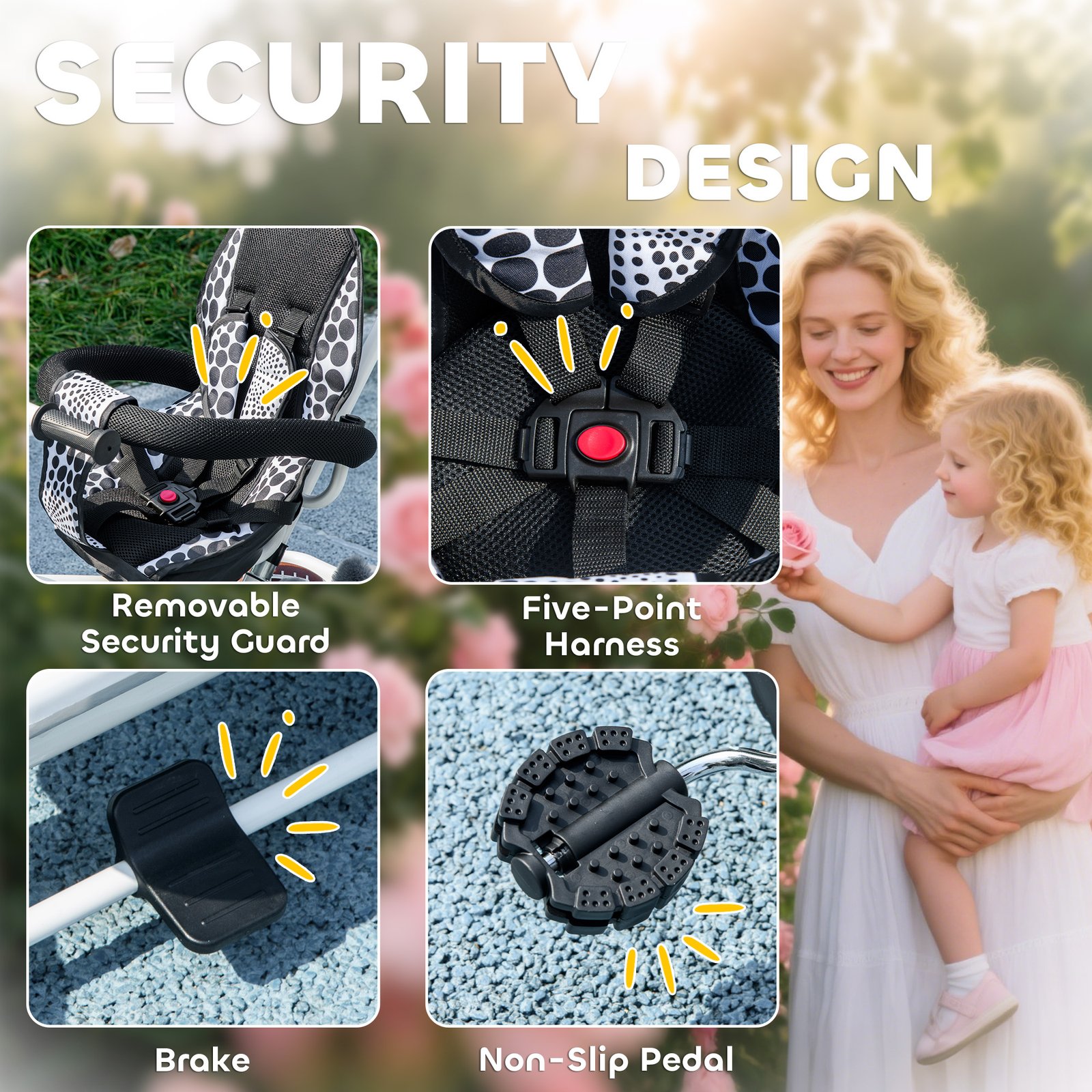 - 5-point safety harness and one-click dual braking ensures child’s security during the ride
