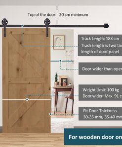 This Modern track system is a perfect way to create a barn style look to your home. Made from carbon steel construction which makes it very sturdy and durable. It comes with all the necessary accessories for easy installation and can be assembled in minutes. With space saving in mind, this would give you the extra space due to sliding motion and no door opening space taken away. Give your home the updated style and elegance with this practical system. Door NOT included.