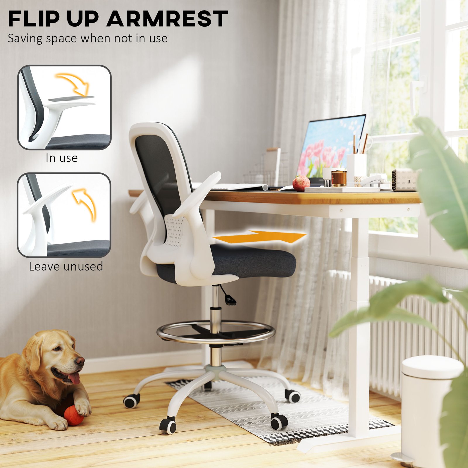 Working at a higher level comes naturally with this HOMCOM draughtsman chair. Move the seat between 99-119 cm – sit to the level you require, without the risk of straining yourself, with a foot ring to hold and support the lower body. It features a padded seat to sit comfortably, with a mesh cover to breathe. Complete with five wheels to move around easily.