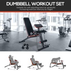 This HOMCOM bench with dumbbells is a great helper to your workouts, perfect for training your arm, leg, waist, hip, and abdomen. You can adjust the backrest in 7 levels to meet your personal workout regime. The bench has a steel frame, able to support up to 120kg and is an ideal addition to your home gym. With the hexagonal dumbbells, you can do push-ups, bicep curls, etc. either for phased workout or relaxing muscles. The compact and folding design save plenty of space for you.