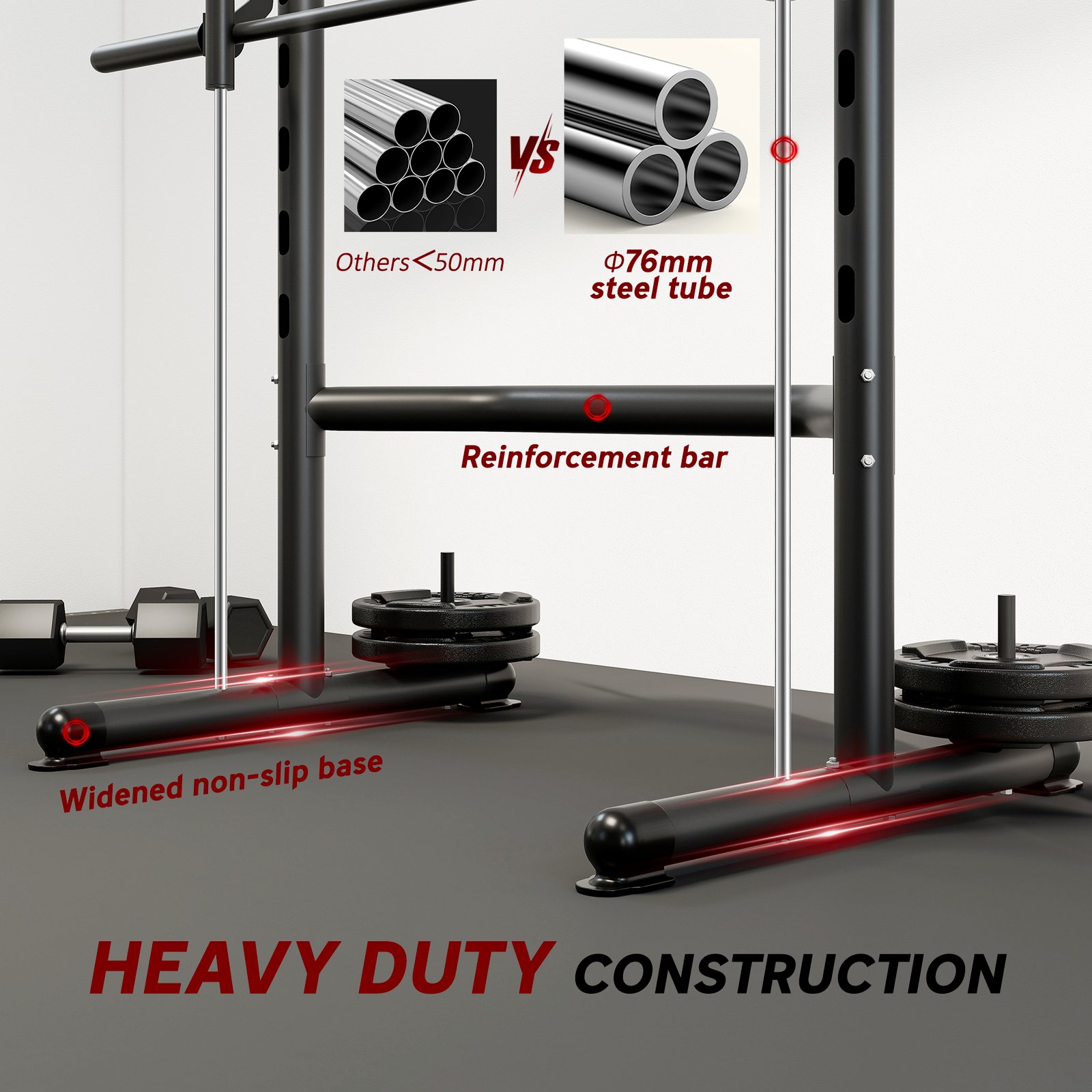 Squats, deadlifts, front rows, pull-ups and much more , this HOMCOM half rack will be your go-to workout station for full-body exercises, working every muscle group efficiently. A solid and stable steel frame, its rubber feet stop the stand from sliding, keeping you safe when exercising. Adjust the squat rack to suit your height, giving you a comfortable workout. Great for keeping active and building muscle, you’ll achieve your fitness goals from the peacefulness of your home.
