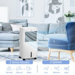 Enjoy a refreshing breeze anytime with the HOMCOM 15-liter cooler fan, featuring two ice packs for enhanced cooling. Choose from nine settings including three speeds and modes like normal, naturaland sleep. It also ventilates and humidifies, ensuring versatile comfort. An eight-hour timer and energy-efficient design are great for overnight use. Control easily via LED screen or remote.