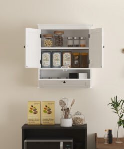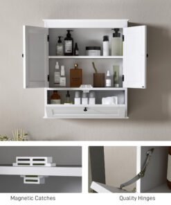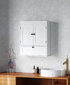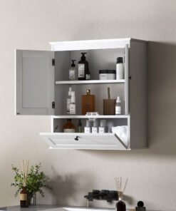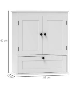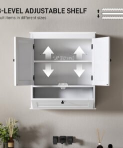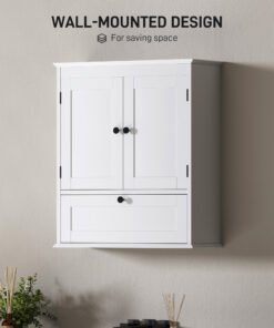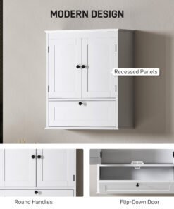 Maximise your bathroom’s style and space with the HOMCOM bathroom wall cabinet! This chic wall-mounted cabinet features three compartments including a two-tier double door cabinet and a flip-down door storage cabinet. Enjoy the flexibility of an adjustable shelf, suitable for tucking away all your essentials in style. The sleek design with round handles and recessed panels adds a touch of elegance to any bathroom.