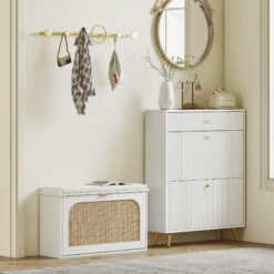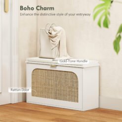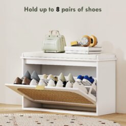 Step into a serene entryway with the HOMCOM shoe storage bench. Tired of clutter? The flip door and double shelf design offer effortless organization, keeping your shoes neatly arranged. Imagine the comfort of a thick cushion as you change shoes, with a breathable linen-feel fabric surface ensuring cleanliness. The rattan door adds a boho touch, enhancing your home’s inviting atmosphere.