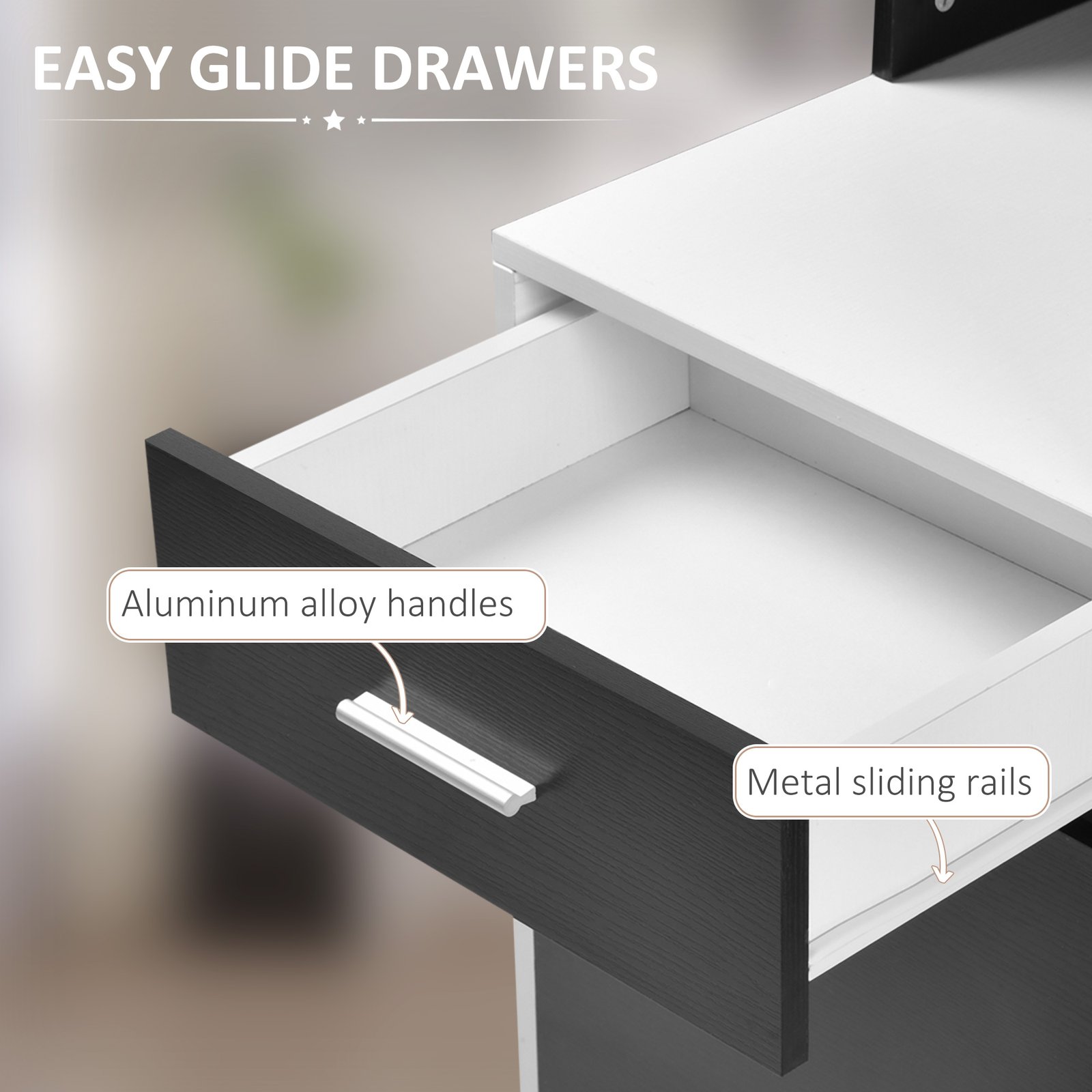 - Gliding drawers with metal rails and aluminium handles to open and close easily