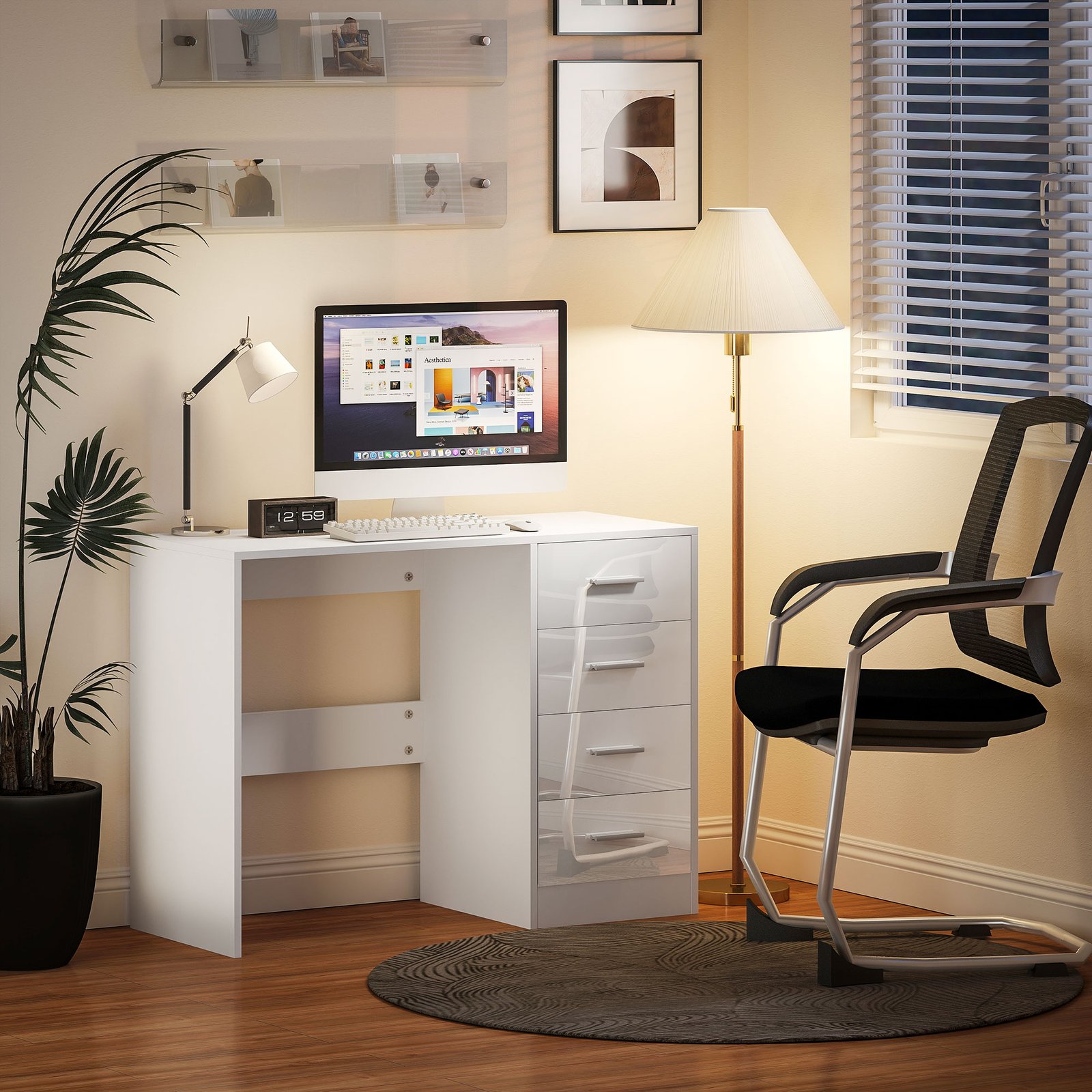 Enhance your home office efficiency with HOMCOM’s modern study desk, designed for those seeking both style and functionality. This sleek, high-gloss desk transforms any space into a productive haven, offering ample desktop area and four spacious drawers for organizing books, important documents, and cherished photos, its sturdy construction ensures durability. Perfect for creating a streamlined, organized environment, this desk is an ideal solution for modern home office needs.