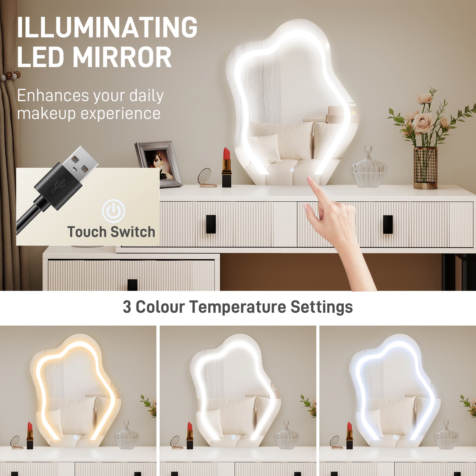 Transform your daily routine with the HOMCOM vanity desk with mirror and drawers! Its USB-powered lighted mirror adds a touch of glam, ensuring flawless makeup application. Tidy up with ease using two bottom and three side drawers. This modern, leaf-shaped mirror makeup desk, complete with a robust metal frame, is the stylish organisational solution you’ve been searching for.