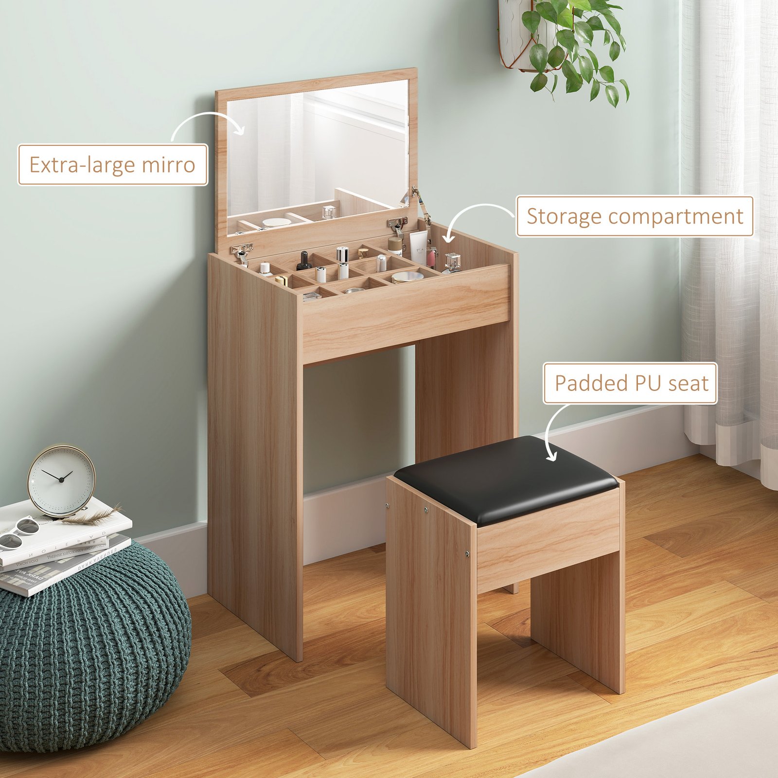 - Easy to convert from a chic dressing table to an ideal writing desk with the flip-up design