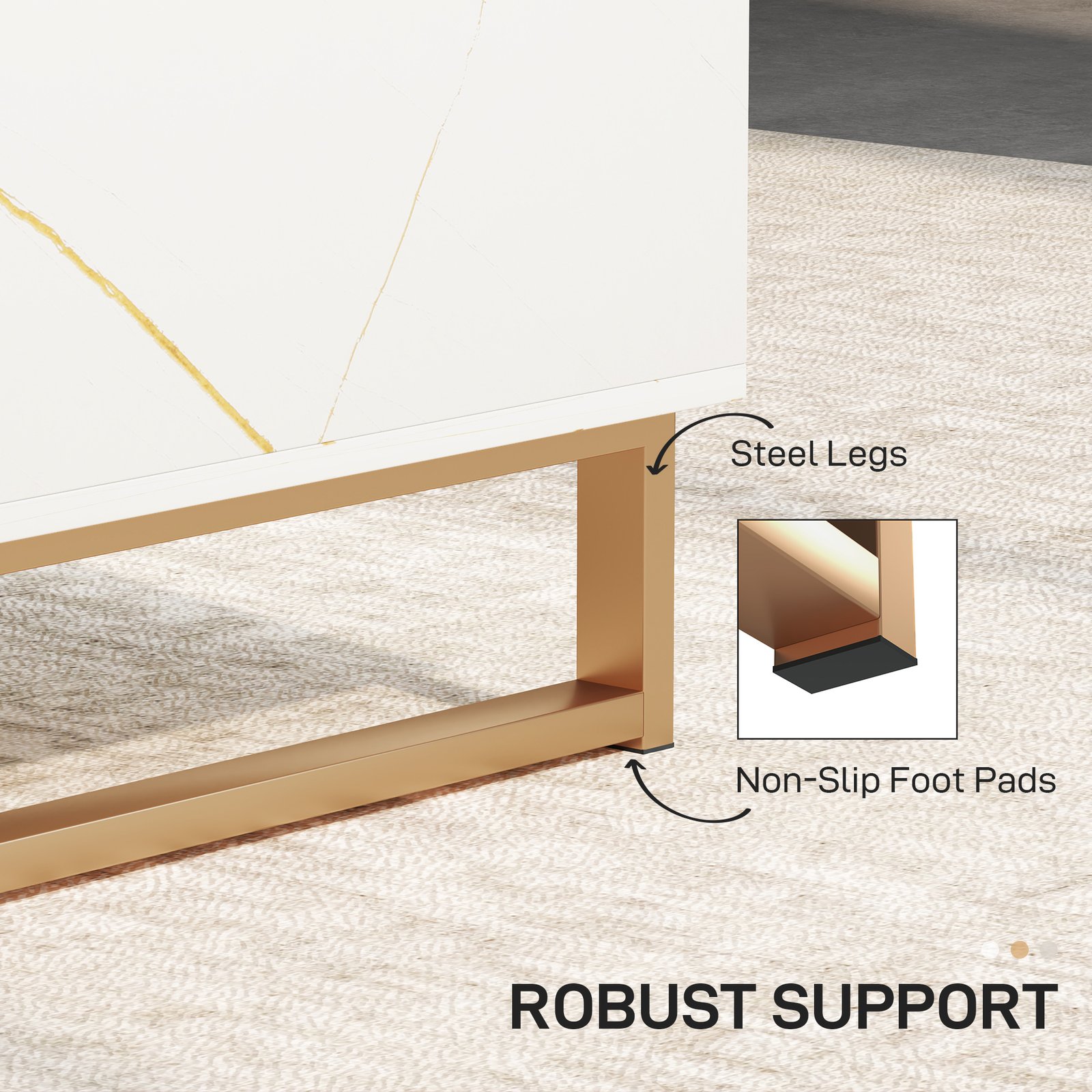 Thanks to the marble-inspired design of this HOMCOM living room coffee table, paired with the gold tone accents, this is an elegant piece for your living space. The modern coffee table has a drawer and large shelf, with a smaller shelf on the other side; complete with steel legs for lots of support.