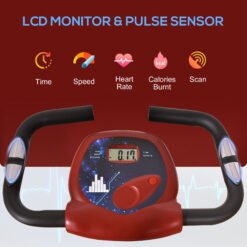 - LCD monitor displays the time elapsed, your heart rate (when hands are placed on the metal detecting panels), speed, distance and calories burnt (2 x AA batteries required, not included)