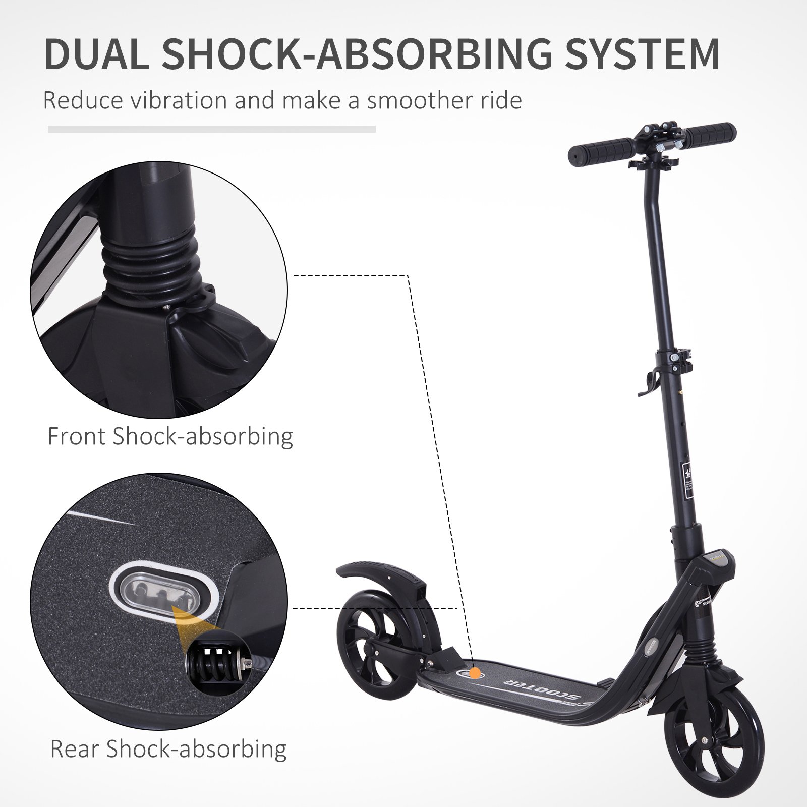 Ride around with this kick scooter adult from HOMCOM. The commuter scooter adult suspension frame is sturdy yet lightweight. It is crafted into an innovative folding design, allowing the commuter scooters to be opened and closed quickly. Adjustable from 95cm to 105cm, the 2 wheel kids scooter’s handlebar is able to comfortably suit a wealth of heights. It is finished with a rear-wheel fender braking system, ensuring not only is this scooter safe to ride on, but it is also both safe and fun.