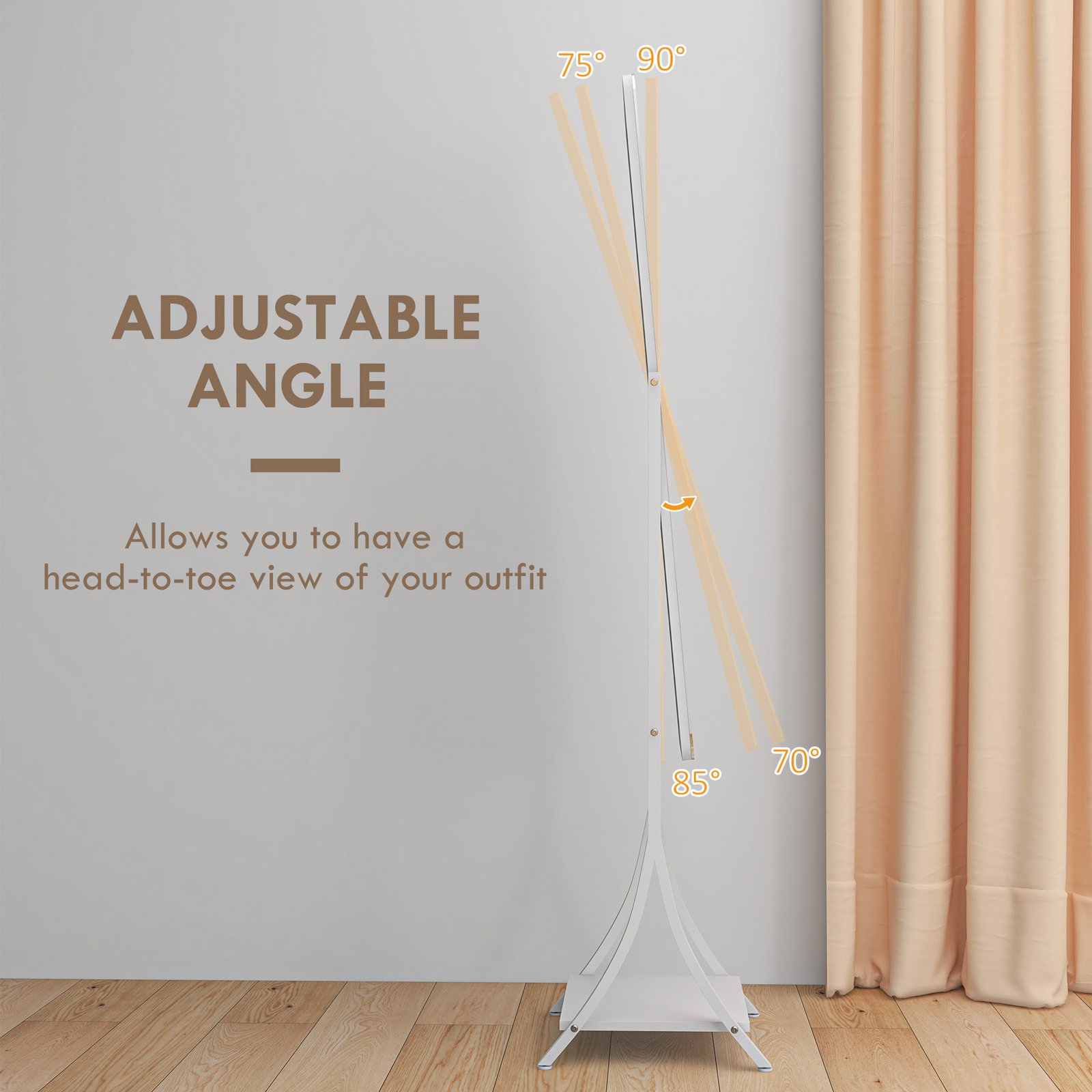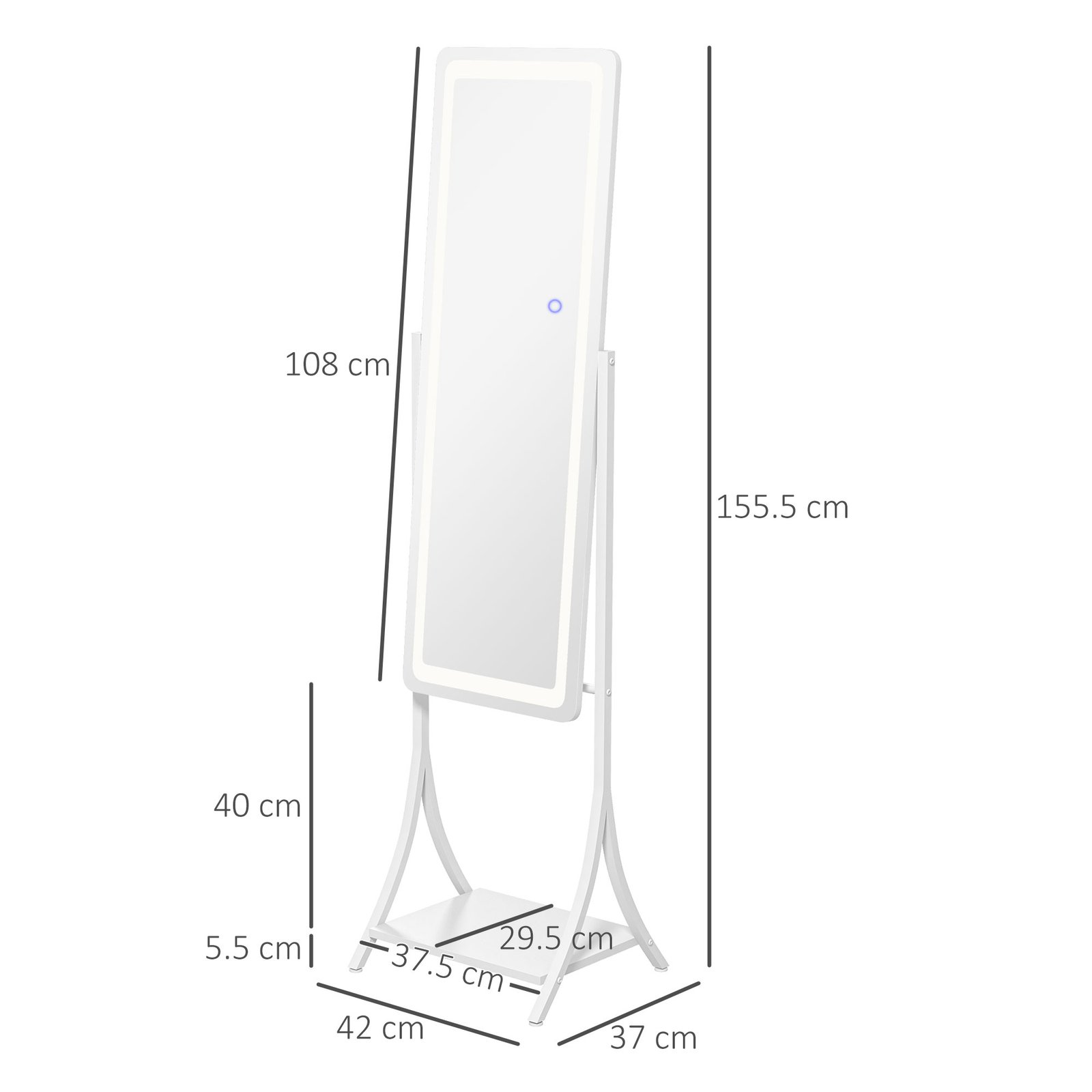 Illumination, day and night, so you can get ready – whenever. This HOMCOM full-length mirror is a classic piece, with a contemporary twist: it comes with an outer LED light to illuminate the mirror whenever you need it. Choose between warm white, white and cool white – with adjustable brightness too. Set the mirror angle to 70, 75, 85 or 90; the full length size is perfect for seeing your whole outfit. Complete with a handy bottom shelf.