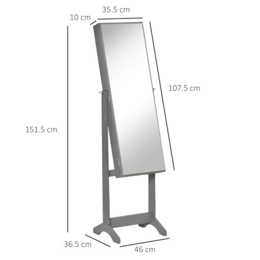 Keep jewellery, perfumes, make-up and accessories organised and easily accessible with this HOMCOM armoire. On the outside, a full-length mirror is fitted, sets to three different angles. Inside, there are 100 earring slots, a bracelet hanger, 24 necklace hooks, 105 ring slots and four shelves – plenty of storage room, you can keep everything together at once. Complete with a two-feet base for balance.