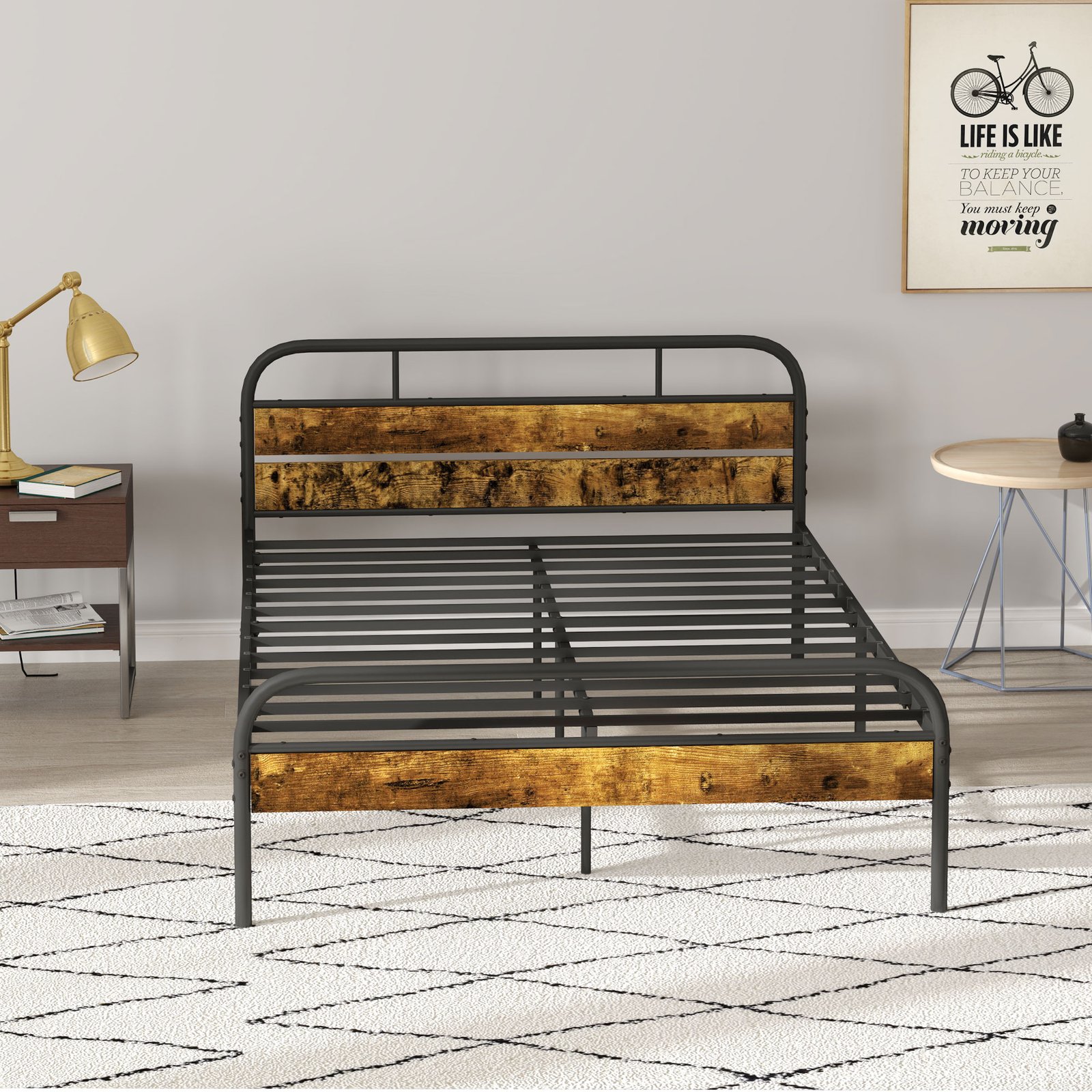 An essential for the bedroom, in industrial formthis HOMCOM double bed base. Made from metal, the structure is strong and supportive, with the 13 slats confidently holding a mattress in place. The 32cm under-bed clearance offers plenty of room for keeping storage discreetly tucked awaykeeping your bedroom looking cleaner than ever before. Complete with wood-effect panels for an industrial-style touch.