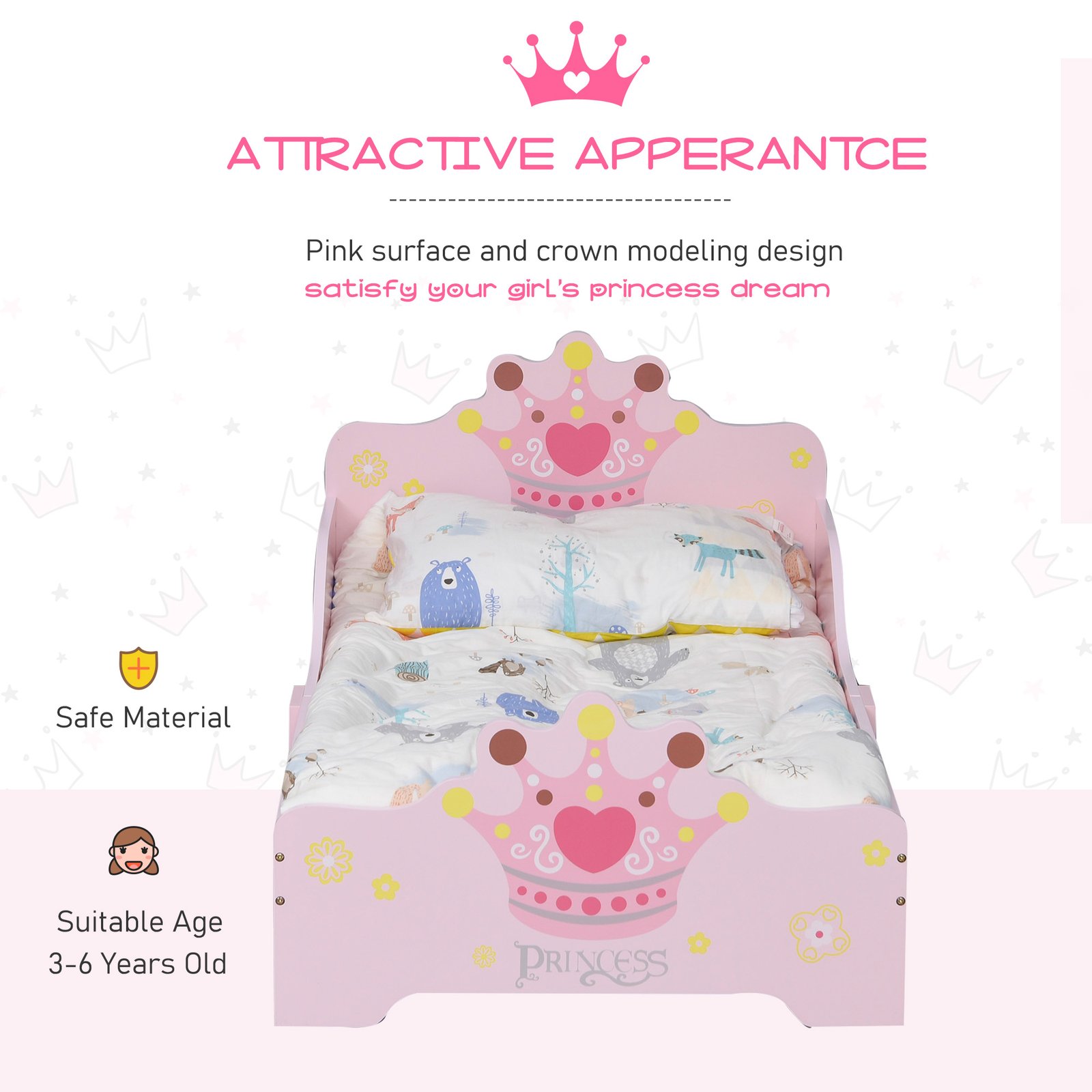 Make them feel like royalty with this HOMCOM children’s bed. The low-rise design helps kids get in and out safely on their own. Built with a robust engineered wood and poplar plywood frame, it offers reliable support for restful sleep. The child-friendly pink finish with a princess crown motif adds a sweet, storybook touch to their room. Slats are included for easy mattress setup. A delightful way to make bedtime smoother and more enjoyable for ages 3-6.