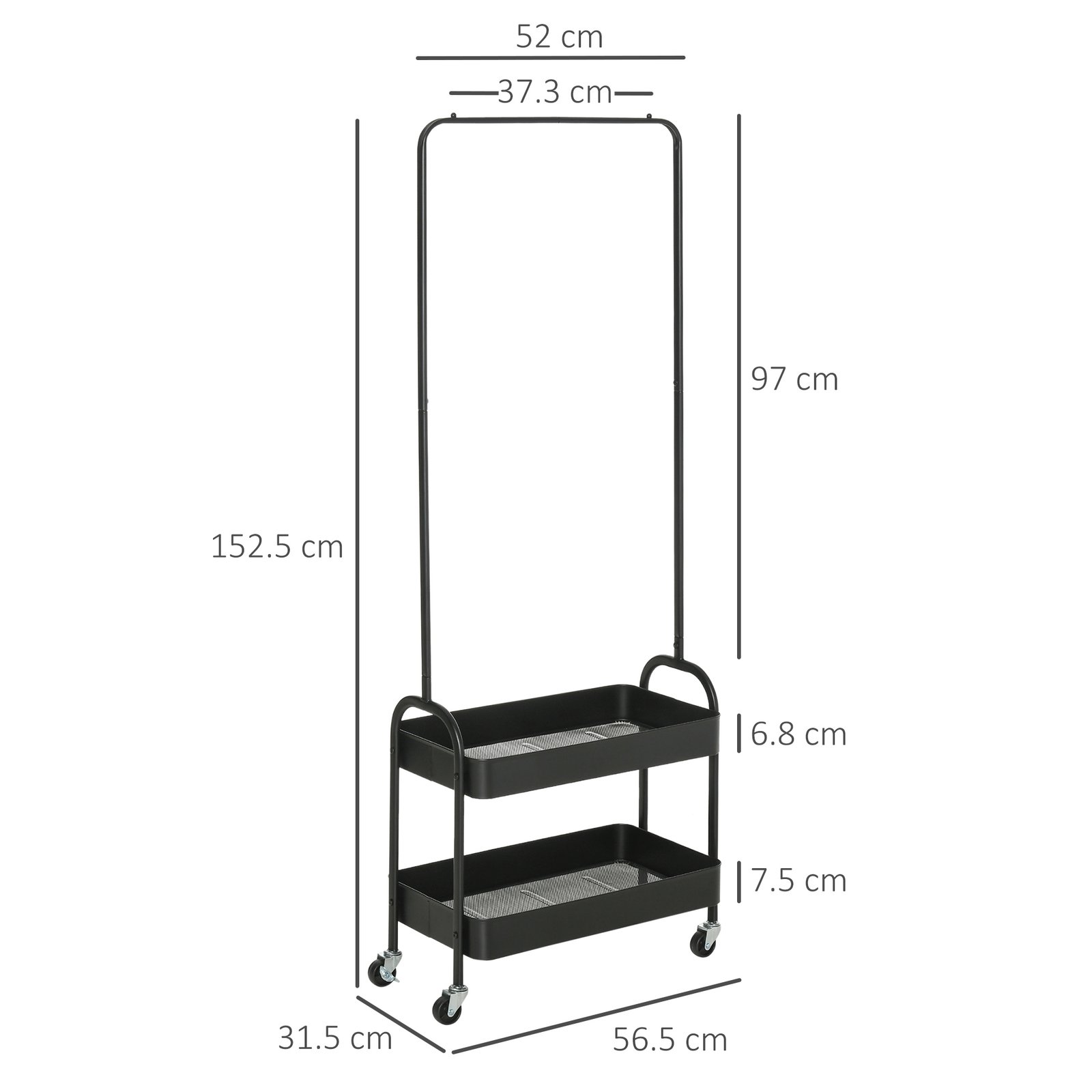 Garment hanging, made mobile with this clothes rack from HOMCOM. The small and compact size of this hanger makes it suitable for smaller chunks of clothing in tighter areas, such as hallways, entrance cupboards, cloakrooms and beyond. The frame, made from power coated metal, is strong and will hold your coats and similar with support. Two trays on the bottom make room for shoes, bags and similar. It’s finished with four wheels to move around easily.