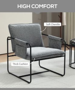 Simple style meets soft comfort with this HOMCOM accent chair. The powder coated steel frame ensures a tough, supportive core, fitted with a padded seat and back cushion for comfort; the soft chenille covers are removable and washable for hygiene. Complete with storage pockets on each arm for keeping magazines, remotes and similar within easy reach.
