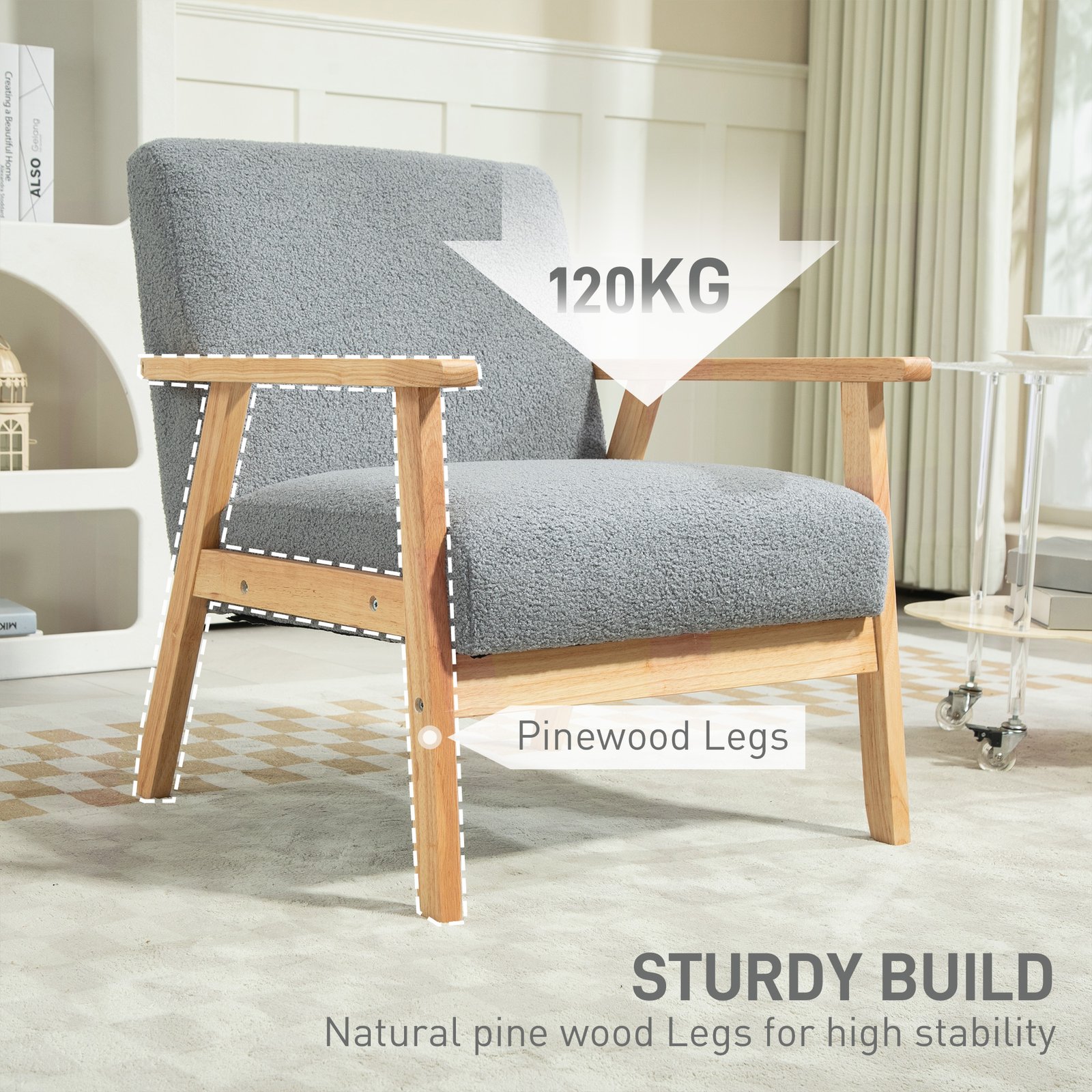 Take it back to basics with this minimalist accent chair from HOMCOM. Using pine wood for a solid and reliable frame, the structure is crafted into a wide design to give plenty of sitting room. The four legs are crafted into a semi A-line shape to provide continual balance and stability, with flats armrests and a high back to provide support to your body. It comes with two thick padded cushions for comfort, both with cashmere covers. Easy to dress up, or down, to however you wish possible.