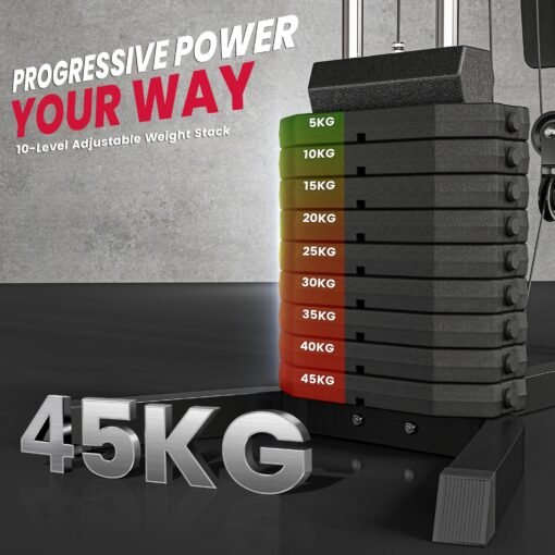 - Multiple exercises, including chest fly, chest press, leg extension, preacher pad curl and lo/high pulley