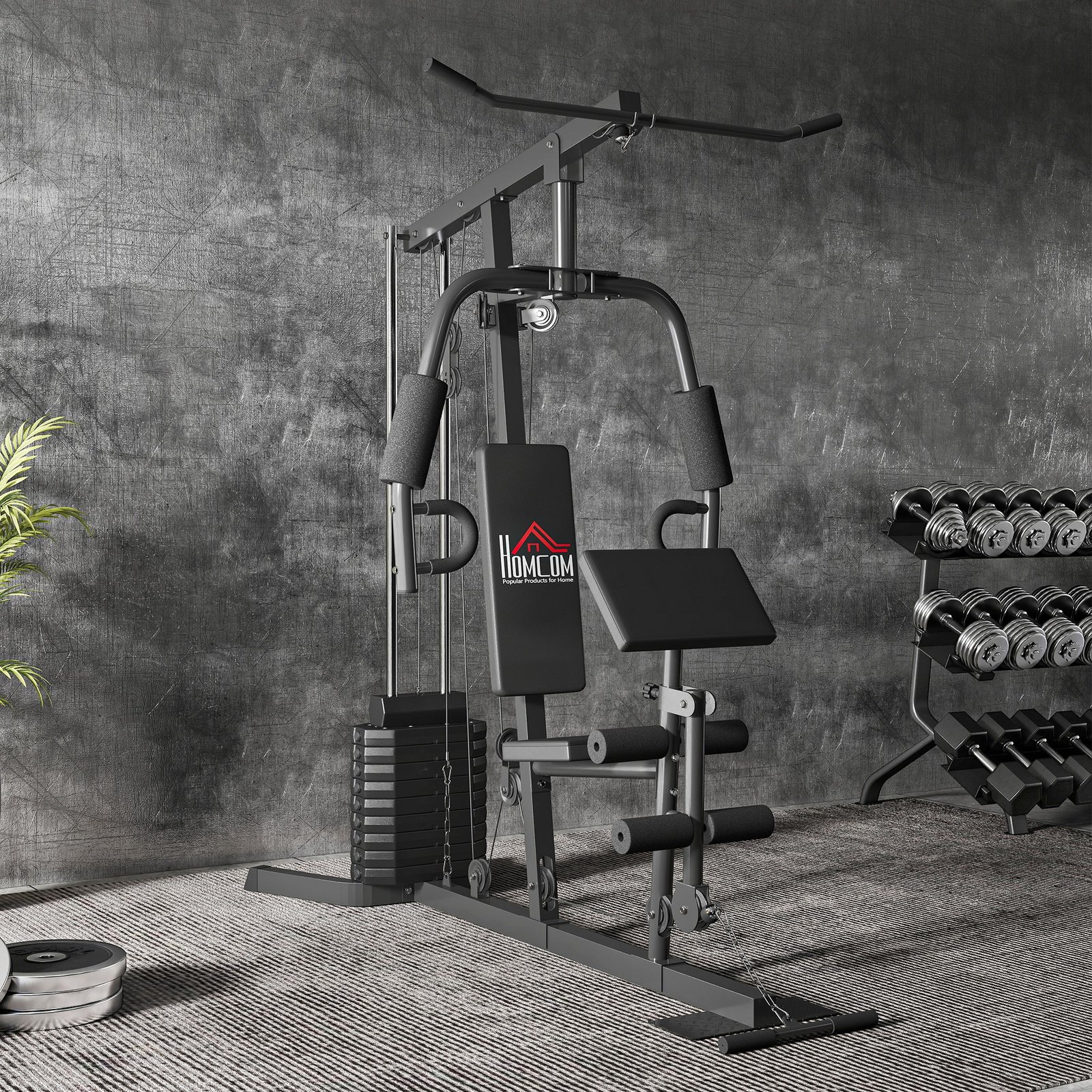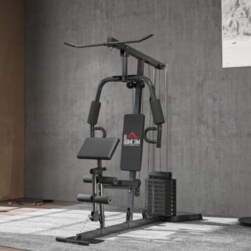Keep in shape with this HOMCOM multi-exercise gym station. You can do lat pulldowns, pec fly, leg curls and leg extensions, making sure you get a full body workout. Sitting on a thick padded seat and backrest, it’s the most comfortable way to exercise. The solid steel frame can hold up to 110kg, keeping you secure. The maximum stack weight is 45kg – choose a weight you’re comfortable with, then increase it to keep pushing yourself. Your very own gym to stay fit, active and build strength.