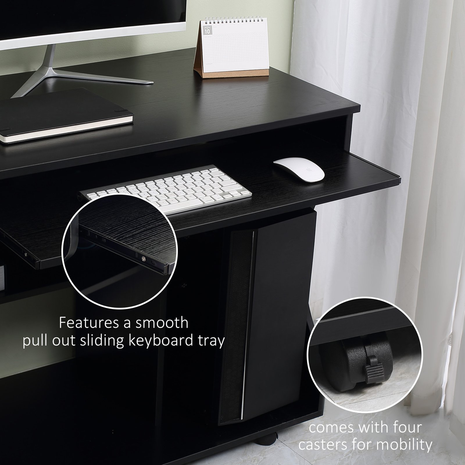 A compact place to work, wherever you want with this HOMCOM small computer desk. It’s fitted with wheels and brakes to move around wherever you want. With the spacious desktop, two pull-out keyboard trays, a CPU shelf and two shelves, there’s plenty of space to work from and keep everything you need in one spot.