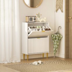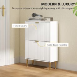 Transform your entryway with the HOMCOM shoe storage cabinet, featuring elegant fluted panel doors and gold tone handles that exude artistic charm. Designed to hold up to 6-12 pairs of shoes, it keeps your space organised and clutter-free. Adjustable shelves in this shoe rack cabinet accommodate sneakers, boots, or heels, ensuring your footwear stays protected. Elevate your home’s style while enjoying a tidy, personalized storage solution.
