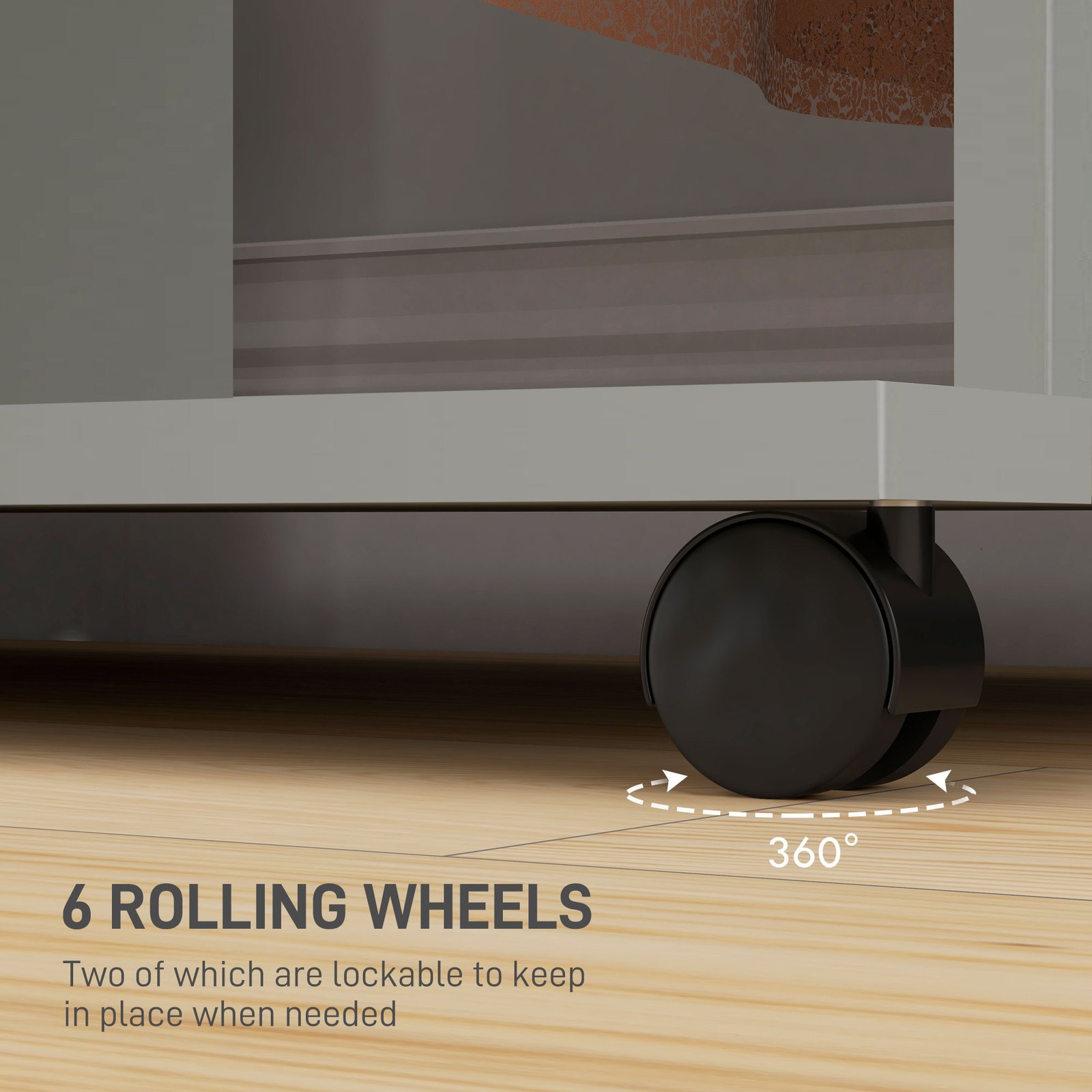 • Six wheels: Convenient mobility, even when open wardrobe with shelves is fully loaded. Two wheels with locking mechanism assure stability.