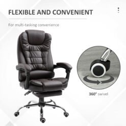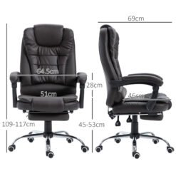 Need a comfortable office chair? Look to this HOMCOM number. Padded all over, with faux leather upholstery, making it a comfortable seat for everyday use. The height and back angle are both adjustable, making it easy to set to a position you find best. A manual retractable footrest to elevate the lower body. High back and armrests for support. Fully swivelling seat to move with your body. Five wheels to move around easily.
