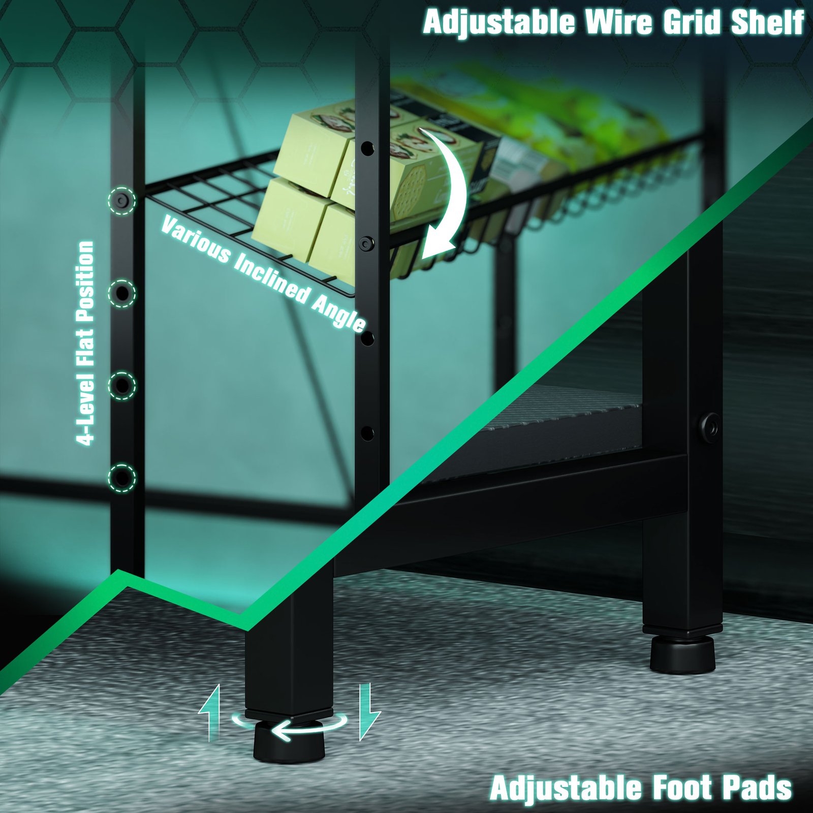 • Multi-storage: L shaped desk has an upper monitor stand, four-level adjustable wire grid shelf that can be laid flat or inclined, lower CPU shelf, side hook, upper monitor shelf and of course its desktop