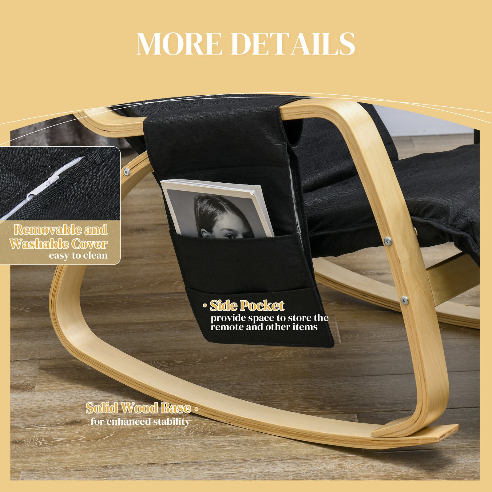 - Strong and supportive birch wood frame, in a relaxing rocking shape