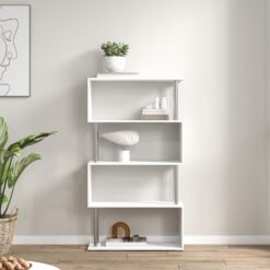 - Modern, S-shaped bookcase offers multi-tiered shelves for convenient displaying
