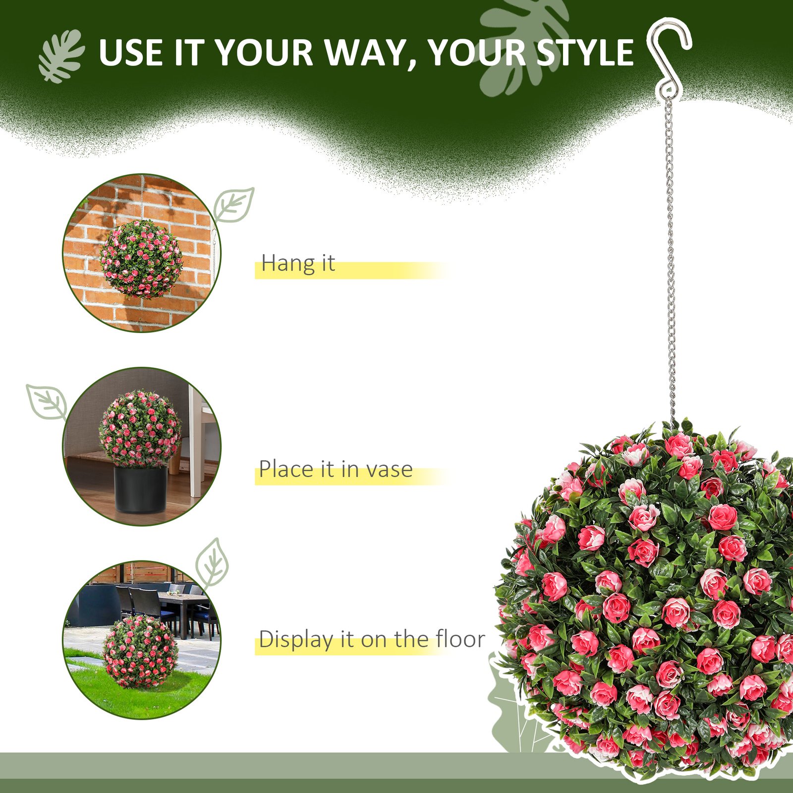 - Each ball has 202 leaves and 202 flowers for fullness