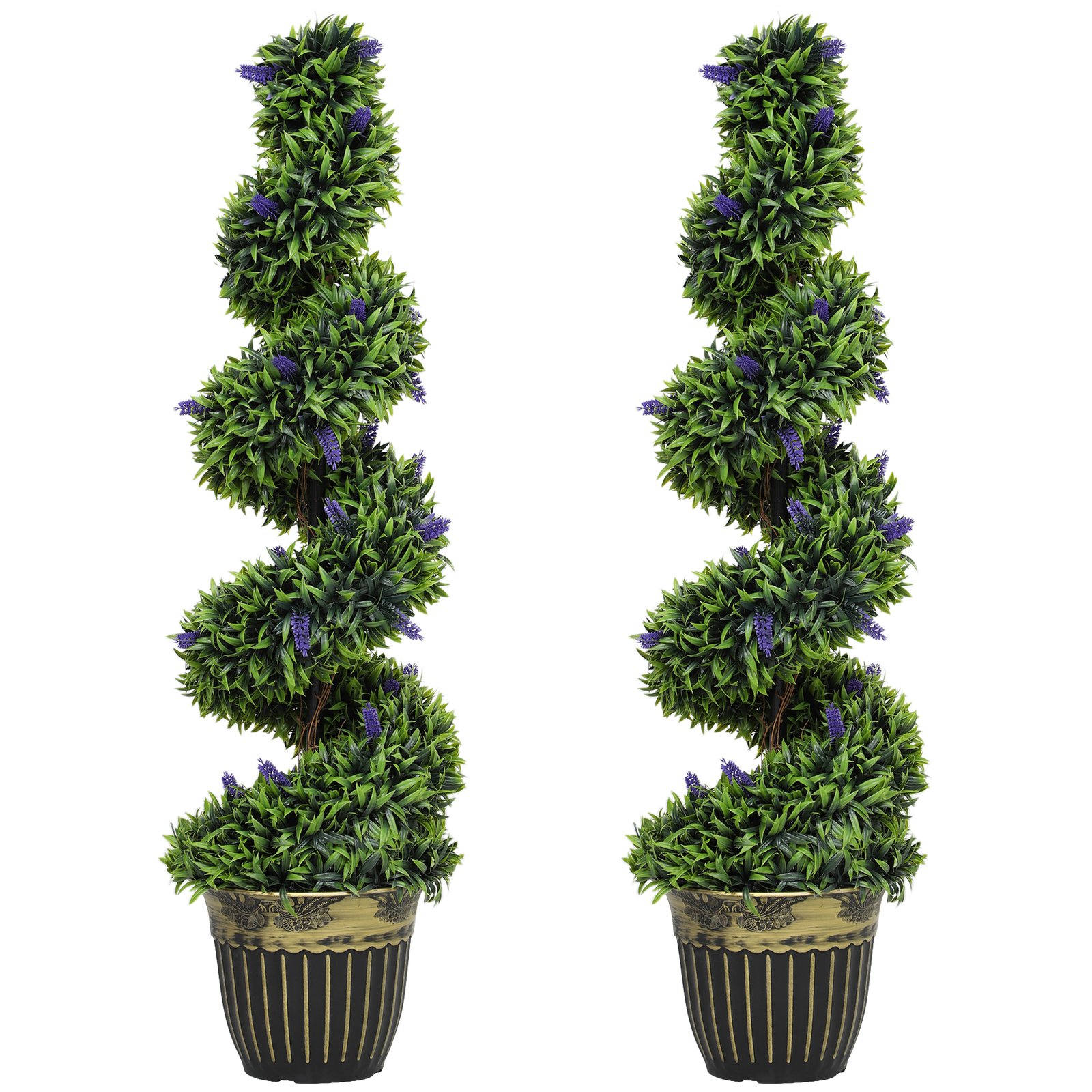 Year-round beautiful greenery with these HOMCOM decorative artificial plants. A spiral design with green leaves and blue lavender, fitted on an elegant black and gold-coloured pot; filled with cement to keep it weighted. A durable design, which looks beautiful without any upkeep – suitable for both indoor and outdoor use.