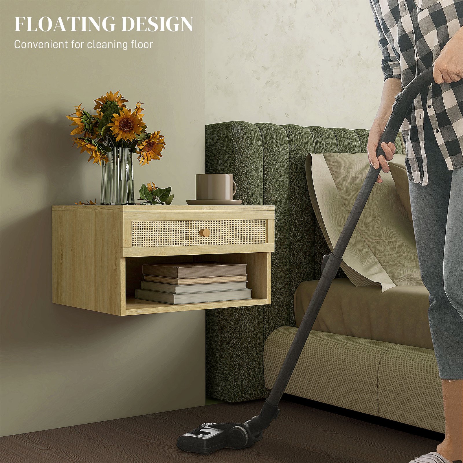Double the bedtime storage, with these two HOMCOM bedside tables. The floating design means no floor space is taken, and you can attach it to any position you want – keep level to your bed. Made from durable particle board in a natural finish, with a rattan weave panel on the drawer which complements the frame. Both nightstands feature a drawer and bottom shelf for storage.