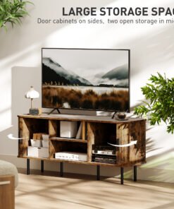 Upgrade your living room with this HOMCOM TV table stand for 55 inch TV. This wooden TV stand does more than holding your TV, it has two open shelves and two cupboard with slatted tambour style door to provide lots of storage space for your favourite movies, a collection of video games or books you love to read. There are two cable holes for organising wires without the mess. Without a doubt, it will be a great companion for your relaxing moments.