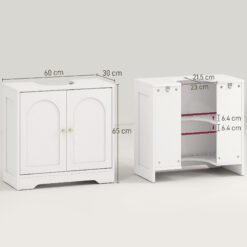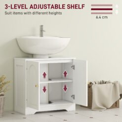 Transform unused space beneath your sink into stylish storage with this under sink unit from HOMCOM. Designed to fit most basins, the under sink storage cabinet features pre-cut U-shaped slots from top to bottom. A three-level adjustable shelf behind double doors keep toiletries tidy. The embossed wood effect texture, arched doors and gold-tone knobs add a refined touch, while the curved base softens the look. Reliable, safe and easy to clean – great for everyday bathroom life.