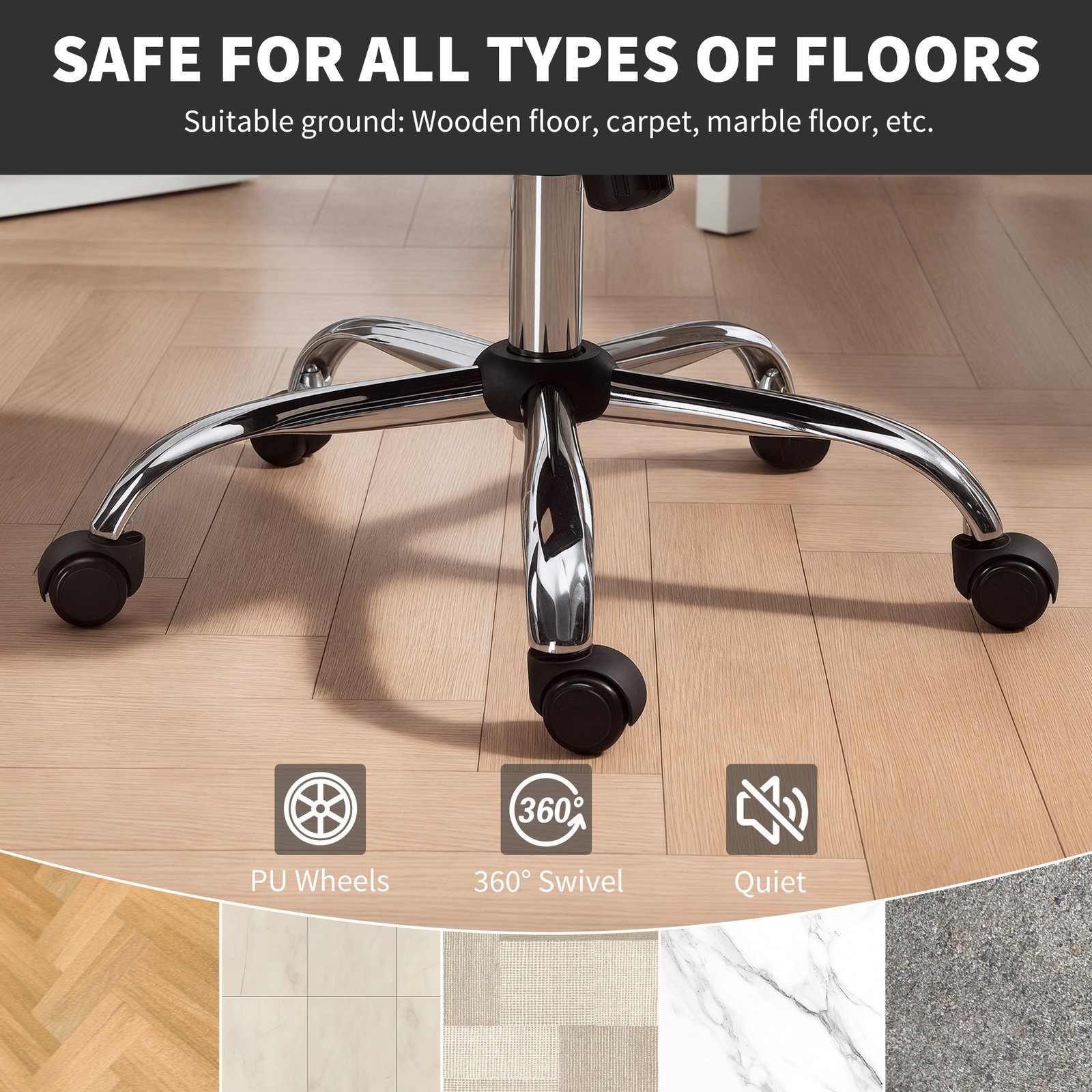 - 360° swivel seat moves with your body, with wheels for smooth movement on various floors