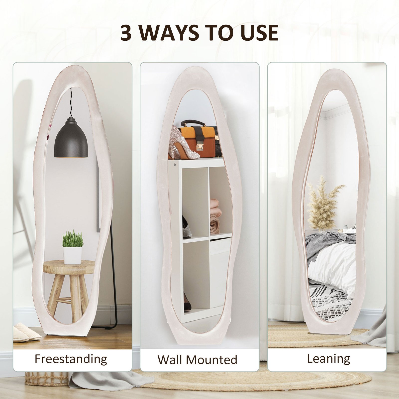 Fun and funky, this HOMCOM wavy mirror creates a statement in your home and beyond. The wavy shape, block colour and velvet-feel finish of the frame all work together to give it a bold, retro look; let it work alongside your furniture, or give it a place which allows it stand out and command attention forever more. Thanks to the full length and thick glass, you can see yourself fully and clearly: you’ll be leaving your home confidently forever more.