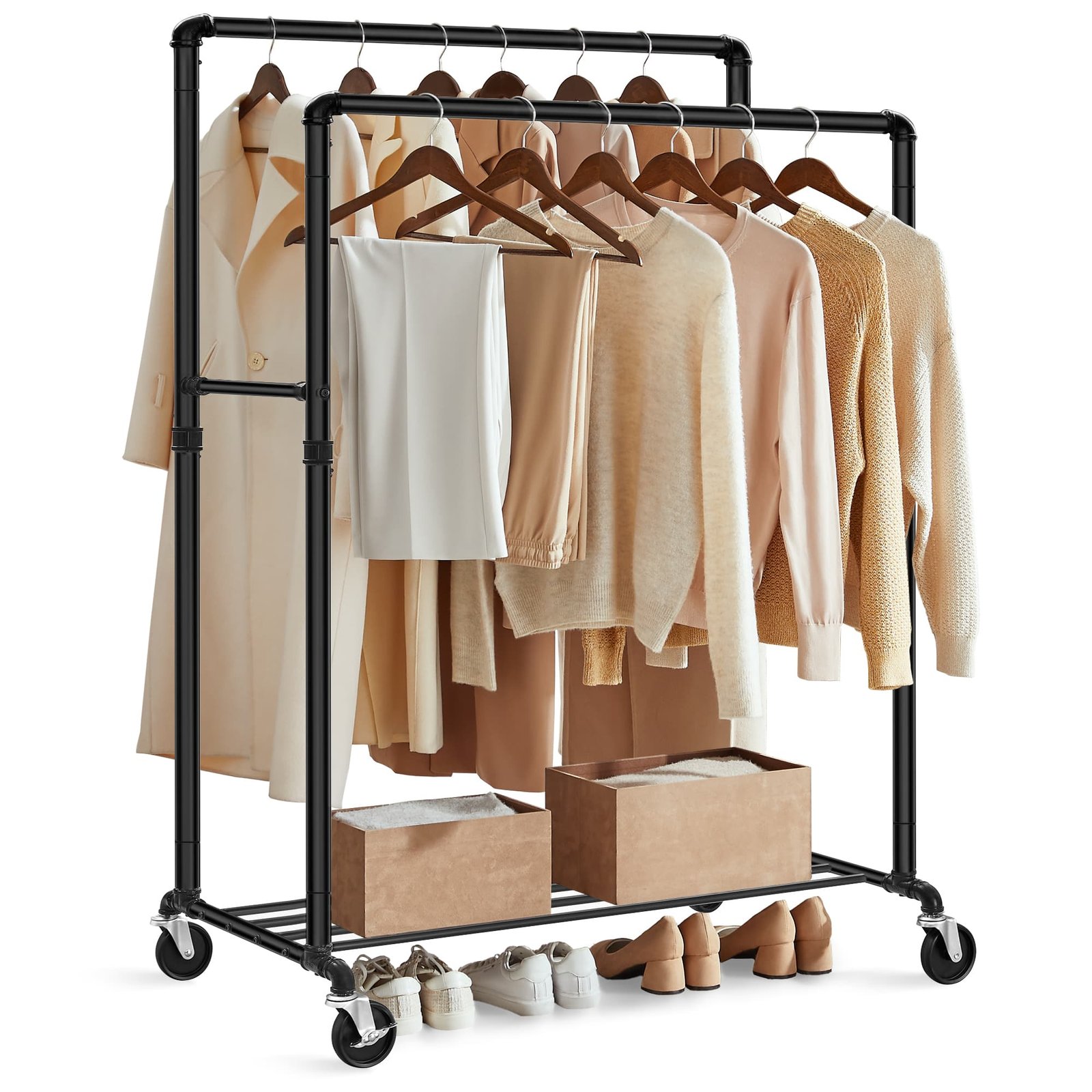 SONGMICS Industrial Pipe Clothes Rack on Wheels, Maximum load of 110 Kg, Double Hanging Rail, Heavy Duty Metal with Shelf, Commercial Grade, Black HSR60B