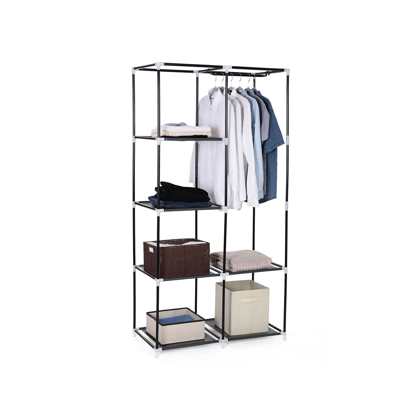 With a hanging rail and multi-tier design, this wardrobe can easily store all your clothes such as trousers, shirts and blouses without worrying about wrinkles. Also, you can place it in your living room, bedroom, utility room or garage to organize clothes, handbags, boots, scarves, gloves and helmets, etc.Specifications:Color: GreyOverall Size: Approx. 88 x 45 x 170 cm (W x D x H)Material: Fabric shelves with film (75g/ m²); fabric cover (75g/ m²); metal tube (dia. 15mm)Packaging Size: 58 x 28 x 9 cm (W x D x H)Product Weight: 2.6 kgPackage Contents:1 x Wardrobe