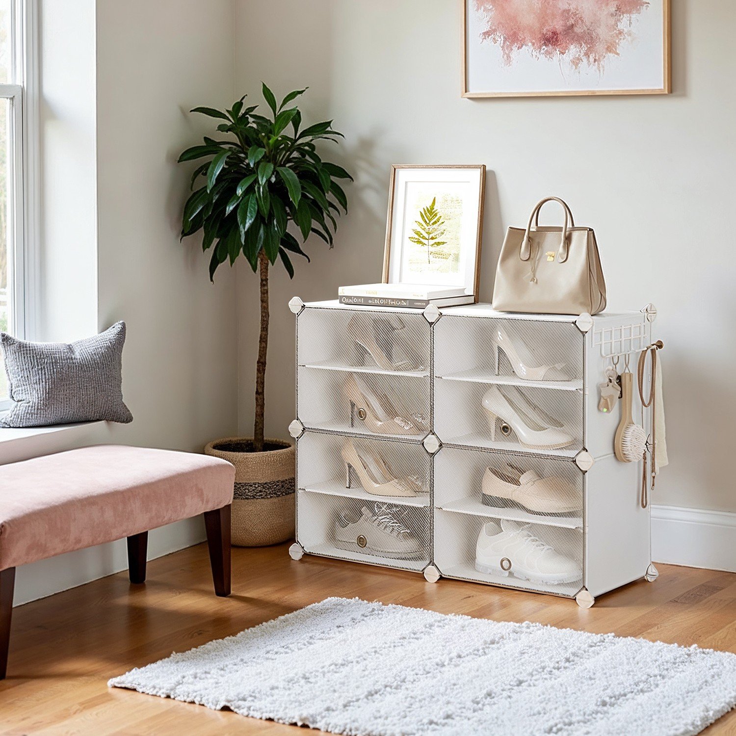Interlocking Shoe Rack, Plastic Shoe Storage Cabinet, 12-Slot Modular Storage Organiser Unit, 30 x 40 x 30 cm for Each Slot, Steel Frame, White