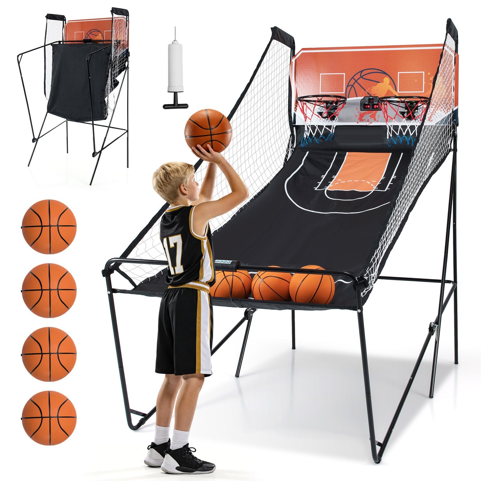 This electronic arcade basketball machine comes with 8 exciting game modes for everyone to enjoy and challenge their basketball skills. This game machine also features electronic scoring with a bright LED display scoreboard, making it easy to keep track of your scores in real-time. And to add an extra level of excitement, the goal scoring sound effects create an immersive and thrilling gameplay experience. Convenience is also a top priority with this game. Its quick folding design allows for easy storage, making it perfect for small spaces. Just remember to insert the secure locking pins for added safety. Foldable Basketball Hoop Machine: Featuring an easy foldable design for your convenience, this kids basketball hoop machine can be folded into a compact size when not in use, which saves your room space. Note: make sure to insert secure locking pins when folded. 8 Playing Modes for More Fun: This electronic arcade basketball game boasts 8 exciting game modes for 1-4 players. Beat the time clock, 3-point beat the time clock, battle back, horse, check point, around the world, left and right shoot and one to one. There’s a mode for everyone! Exciting Game Experience: The bright LED display scoreboard provides accurate and real-time scoring, allowing you to keep track effortlessly. Plus, the goal scoring sound effects allow you to enjoy more exciting game experience. Selected Material and Reliable Structure: Designed to withstand intense play, this kids arcade game features the reinforced board and hoop, wear-resistant protective net. Besides, the rustproof powder-coated metal frame and non-slip foot pads guarantee stability, while the premium rubber basketball ensure long time use. Rich Accessories Included: This dual shoot basketball arcade game comes with wonderful accessories included: 4 x basketballs, 2 x basketball hoops, 1 x Inflation pump. Whether kids want to enjoy competitive play with friends or practice their shooting technique, it provides endless entertainment and encourages active play.