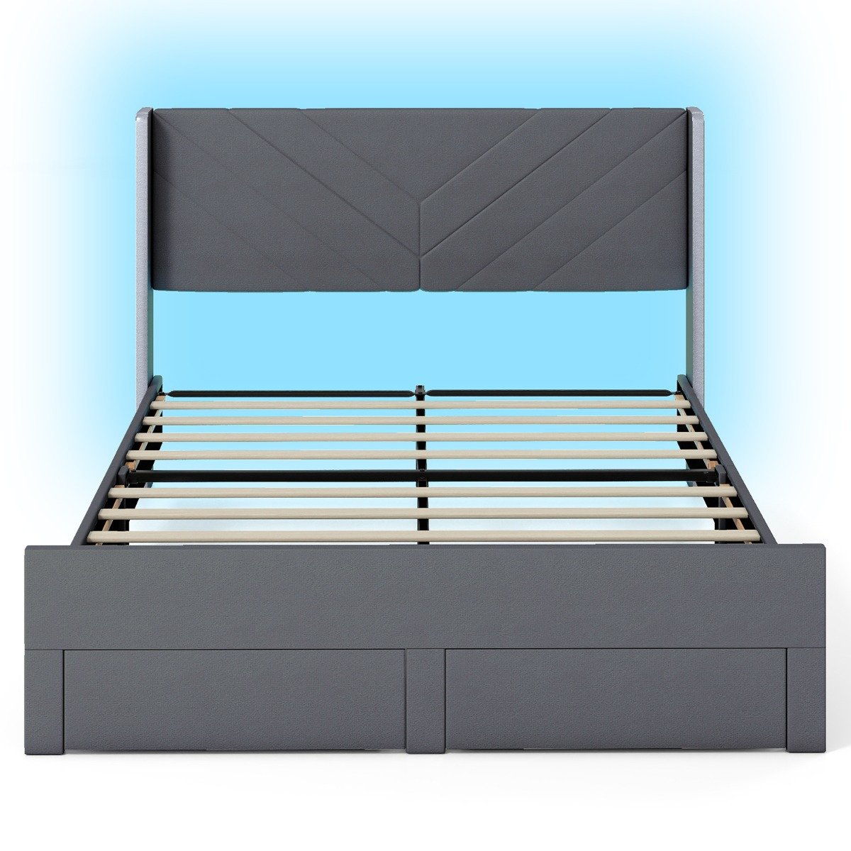 Dive into the luxury of our wingback headboard bed, wrapped in plush dutch velvet with sparkling silver accents that dance in the light. Get ready for a mesmerizing light spectacle! Our bed frame features RGB LED lights that sync to your favorite tunes, controlled right from your smartphone or included remote. It’s party-ready and perfect for creating a dreamy atmosphere! Plus, stash away clutter with ease in the 2 smooth-gliding storage drawers. Experience unparalleled support and silence with our robust, squeak-free frame—no box spring needed. Just set up in moments and enjoy endless nights of glorious sleep and enchanted evenings. Elevate your decoration and sleeping experience in one brilliant bed frame! BulletPoint: Chic Wingback Headboard: Wrapped in skin-friendly Dutch velvet and generously padded, the tall wingback silhouette is finished with silver glitter trim that catches the light for instant boutique-hotel glamour. The wingback bed frame turns any bedroom into a modern sanctuary while giving you a cozy spot to lean back and read. RGB LED Light Show: Hidden behind the frame, the strip cycles through 60,000 colors or creative dynamic modes (music sync and mic mode). Pair this modern platform bed with your playlist on your smart phone APP and watch the colors pulse for a party-ready vibe. A remote control is also included for added convenience.Built-in Rolling Storage: The 2 spacious drawers glide on smooth wheels, keeping extra linens, shoes or games neatly out of sight. The upholstered bed frame with storage like this frees up floor space so your room feels bigger and stays clutter-free year-round. Rock-Solid Quiet Frame: The heavy-duty metal center support bar and 8 solid-wood slats hold up to an impressive weight; adjustable foot pads eliminate wobble while foam-padded crossbar hush every squeak. This slatted bed frame delivers hotel-level stability and years of restful sleep. Box-Spring-Free Setup: Slats with hook-and-loop fasteners secure in place in seconds, —just drop on your 25cm mattress and plug in the LEDs. This king size mattress foundation provides a supportive platform, requiring no box spring.