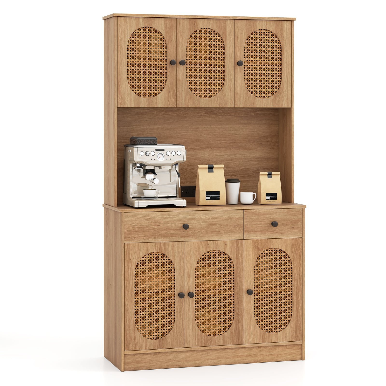 Kitchen Storage Cabinet with Charging Station and 6 Rattan Doors-Natural
