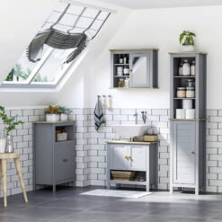 Bathroom storage doesn’t always have to be clean and contemporary. If you’re looking for something a little different – go for this on-wall storage cabinet from kleankin. A slightly boxy shape pairs with the mid-grey tone for some retro rustic charm. It is formed of a main mirrored cabinet and three side shelves for a mix of open and discreet storage. The top panel is flat for extra holding room. Made from MDF, the structure is pretty sturdy and is suited to moisture-filled environments.
