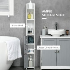 • Mixed storage: This narrow bathroom organiser features three open shelves and three compartments with doors. Plenty of room to organise bathroom essentials.