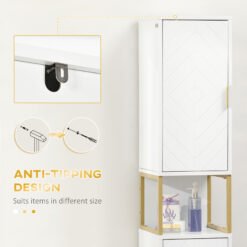 Store bathroom essentials in style: do it with this kleankin slim bathroom cabinet. Comes with two large cupboards and middle shelf. The tall, slim design is great for smaller rooms. Clean white structure, with embossed doors for gentle character; finished with a gold-coloured accents.